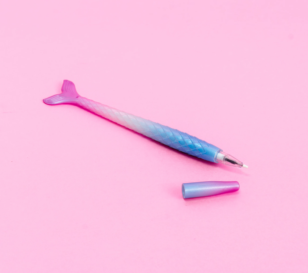 A whimsical writing pen designed with a shimmering mermaid tail end and