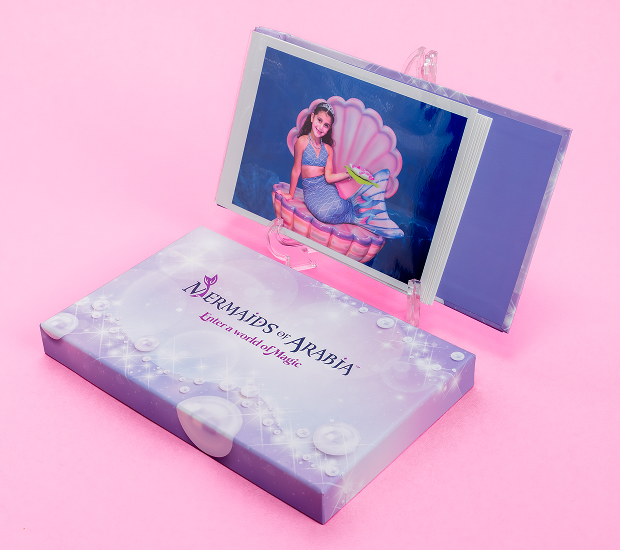 A hardcover album with mermaid-inspired cover art, designed to store and
